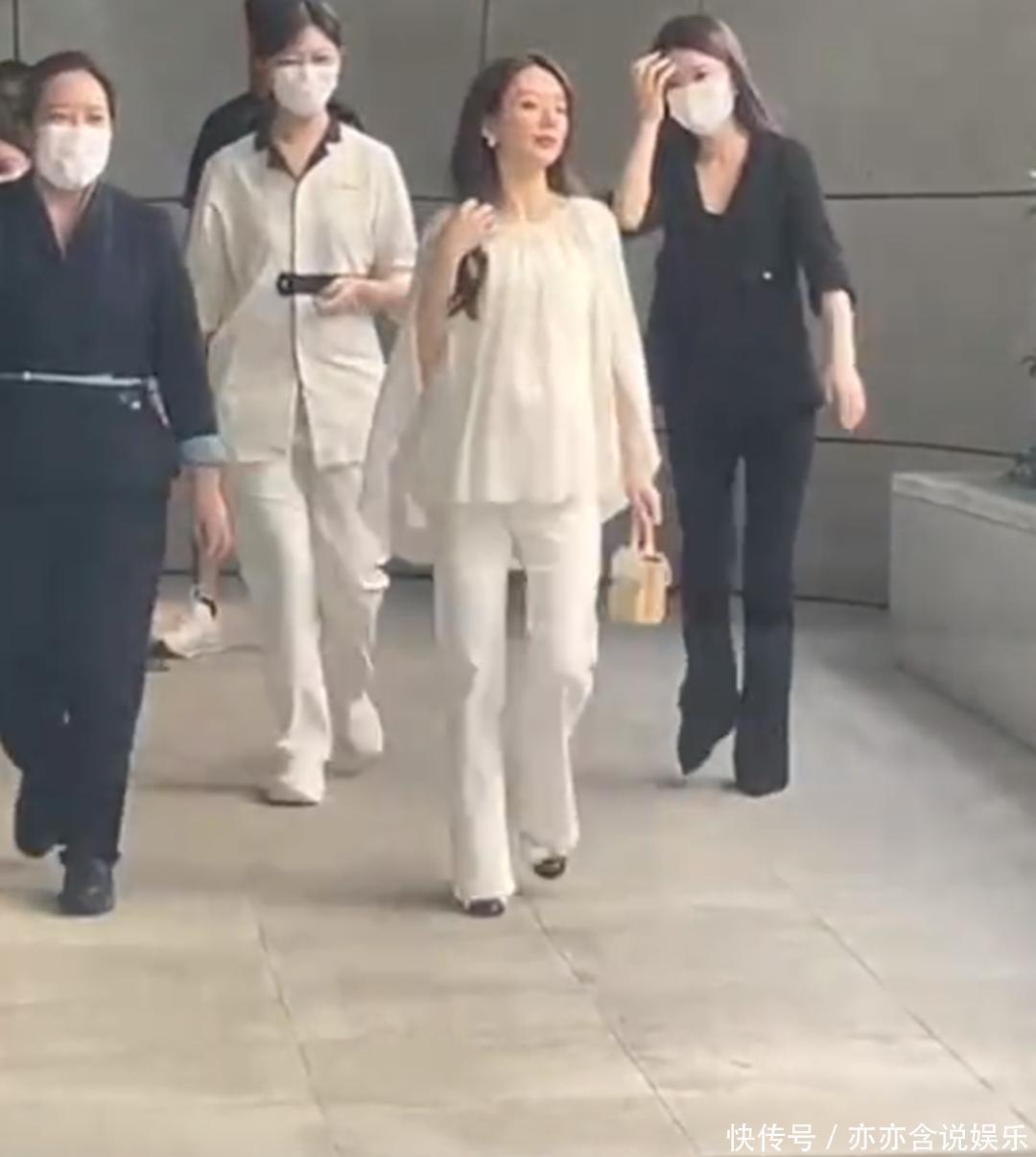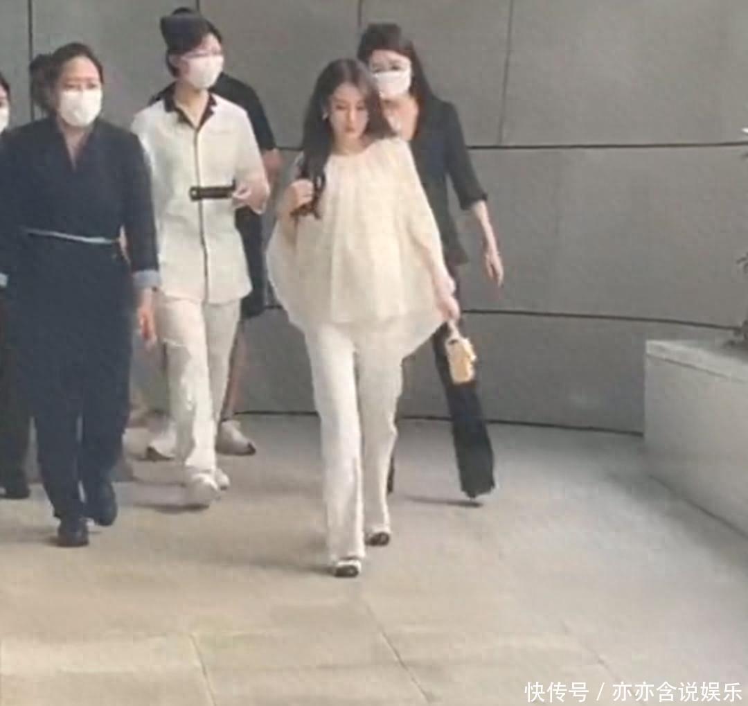 视频里方媛走在最前面,打扮得挺精致,发现有人拍她,还停下来理了理头发脚踩高跟鞋,挺着大孕肚走路,大摇大摆却稳当,身后跟着六七个工作人员送她出门